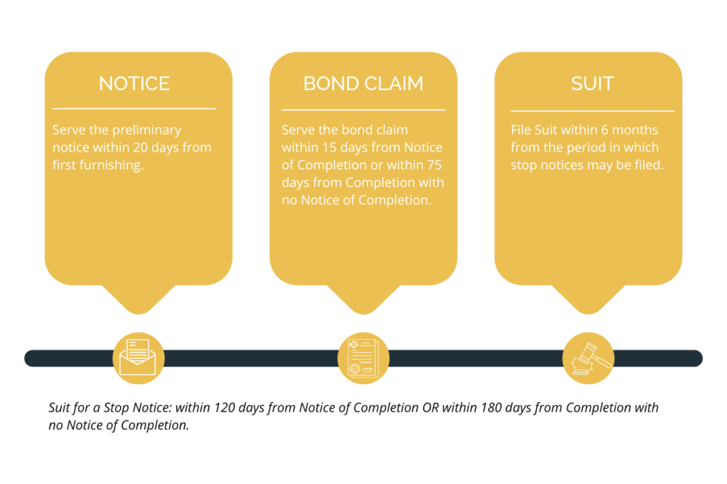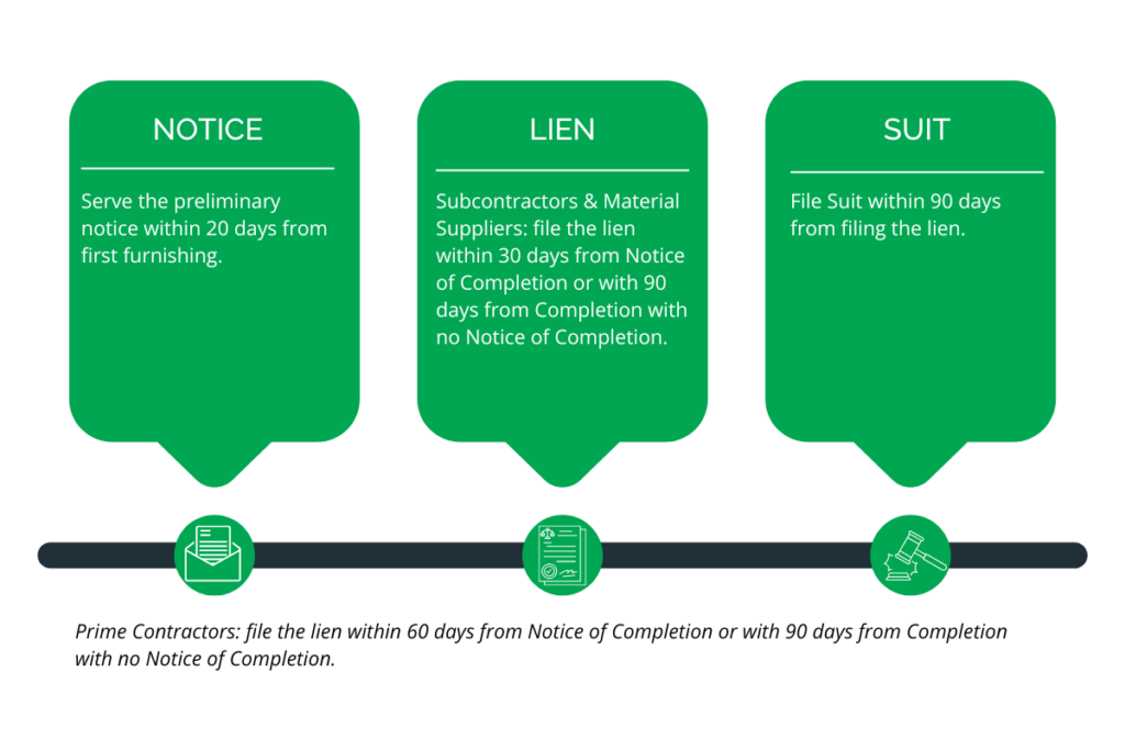 While the details outlined in California mechanic’s lien and bond claim statutes are specific and require strict compliance, here’s an at-a-glance look at the steps and timeframes to protect construction mechanic’s lien and bond claim rights.